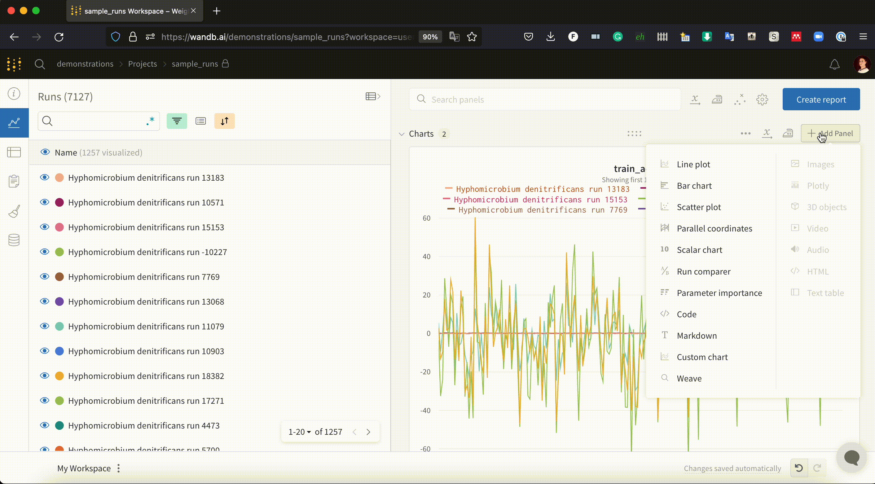 また、プロットとMarkdownを並べて追加できるレポートを作成することもできます。さまざまなセクションを使って異なるrunを表示させ、作業内容をストーリ仕立てで伝えます。これらのノートは保存・共有できます。