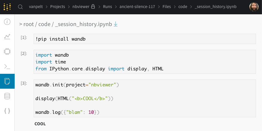 wandb バージョン 0.8.34 から、当社のライブラリはJupyterセッションの保存を行います。Jupyter内で wandb.init() を呼び出すと、現在のセッションで実行されたコードの履歴を含むJupyter notebookを自動的に保存するフックを追加します。このセッション履歴は run のファイルブラウザー内のコードディレクトリーに表示されます:
