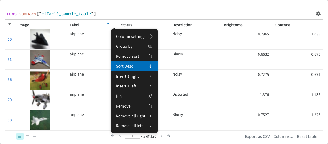 runsis a variable automatically injected in Query Panel Expressions when the Query Panel is in a Workspace. Its "value" is the list of runs which are visible for that particular Workspace. Read about the different attributes available within a run here.summaryis an op which returns the Summary object for a Run. Note: ops are "mapped", meaning this op is applied to each Run in the list, resulting in a list of Summary objects.["cifar10_sample_table"]is a Pick op (denoted with brackets), with a parameter of "predictions". Since Summary objects act like dictionaries or maps, this operation "picks" the "predictions" field off of each Summary object.