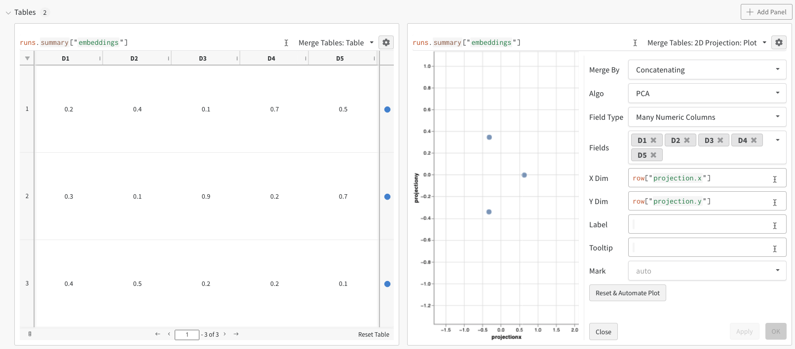 上記のコードを実行した後、W&Bダッシュボードには新しいTableがデータとともに表示されます。右上のパネルセレクタから 2D Projection を選択すると、Embeddingsを2次元でプロットできます。スマートデフォルトが自動的に選択され、ギアアイコンをクリックしてアクセスする設定メニューで簡単に上書きできます。この例では、利用可能な5つの数値次元すべてが自動的に使用されます。