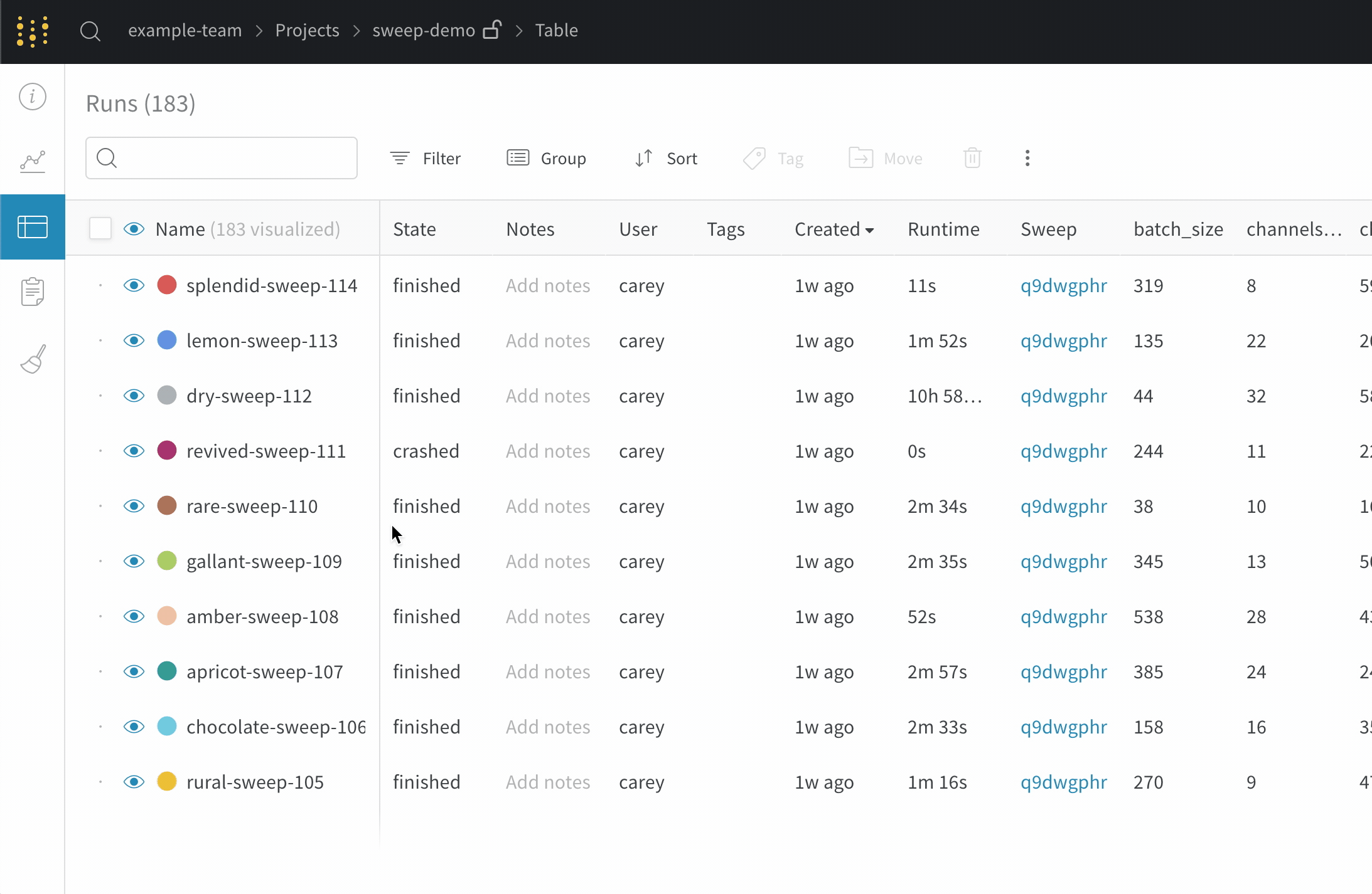 記録されたメトリクスの最小値または最大値で runs テーブルをソートします。これにより、最も良い(または悪い)値を確認するのに役立ちます。