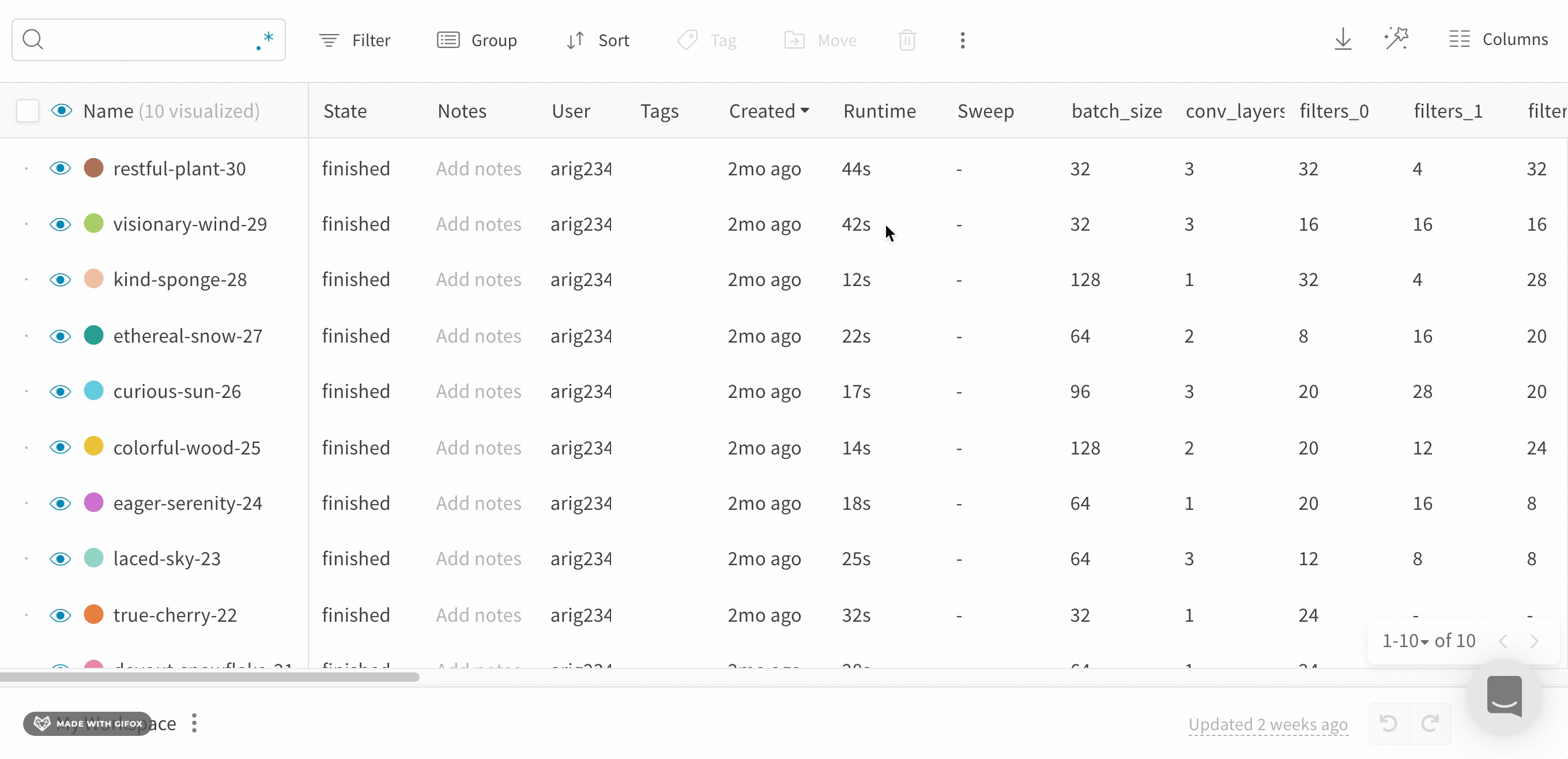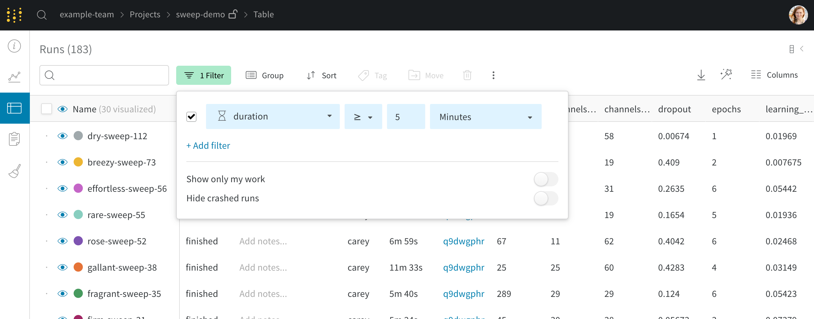 クラッシュした runs を非表示にしますか?短い runs がテーブルを埋めていますか?グループプロジェクト内で自分の作業だけを見たいですか?フィルタを使用してノイズを非表示にできます。以下のフィルタを推奨します: