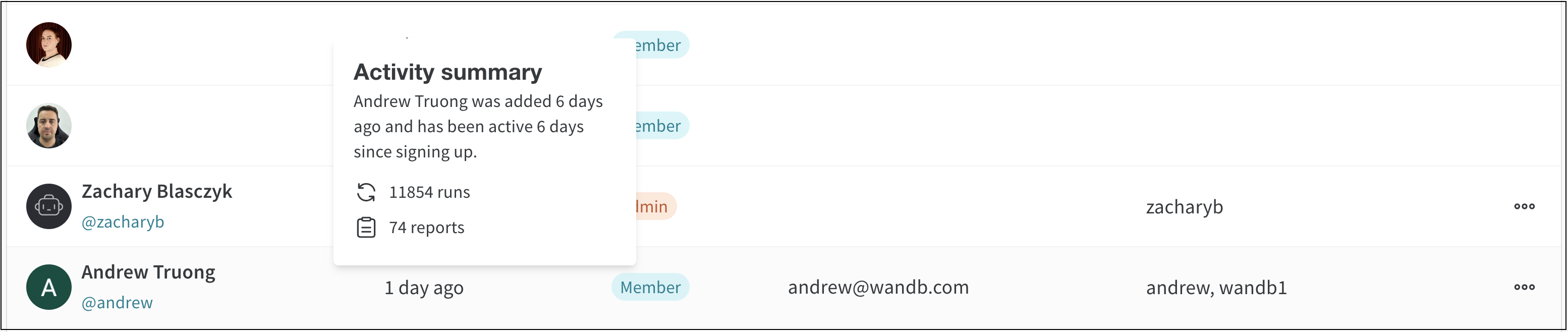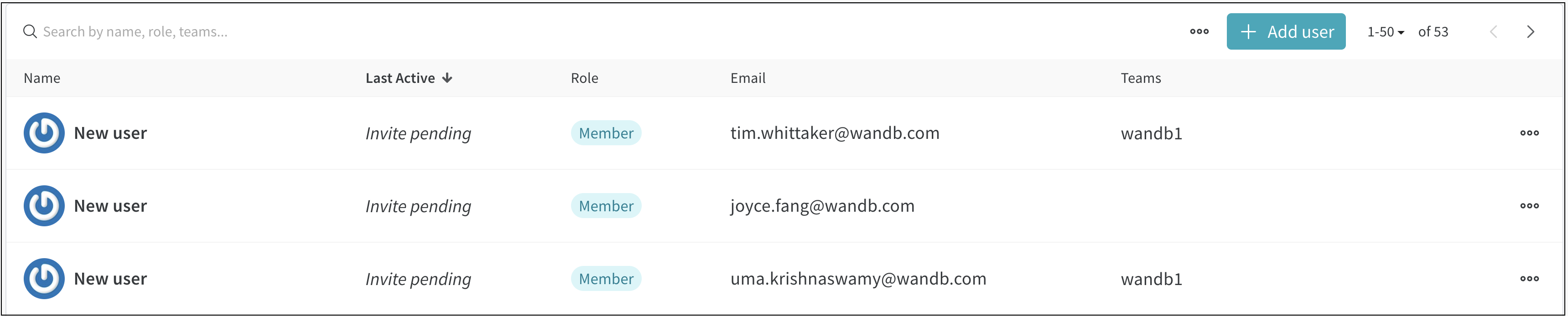 • Last active: ユーザーが最後に W&B を使用した時間。これには、製品のページを閲覧する、run をログする、その他の操作を行う、またはログインするなど、認証が必要なすべてのアクティビティが含まれます。