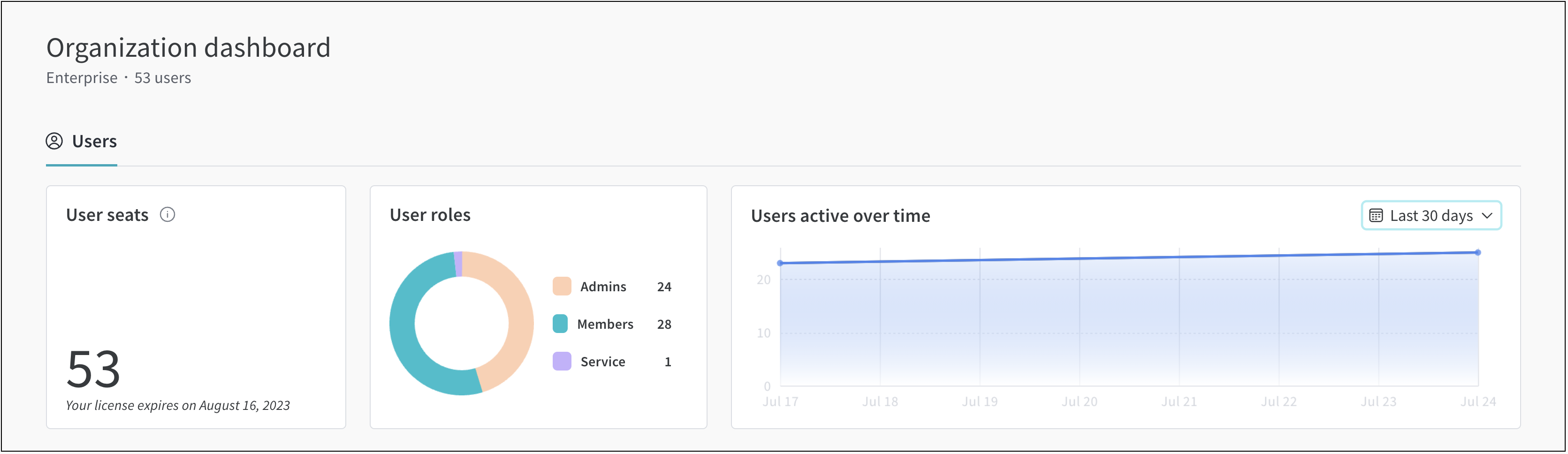 組織ダッシュボードの Users active over time プロットを使用して、時間経過によるアクティブユーザーの総合的な概要を取得します(以下の画像の最右プロット)。