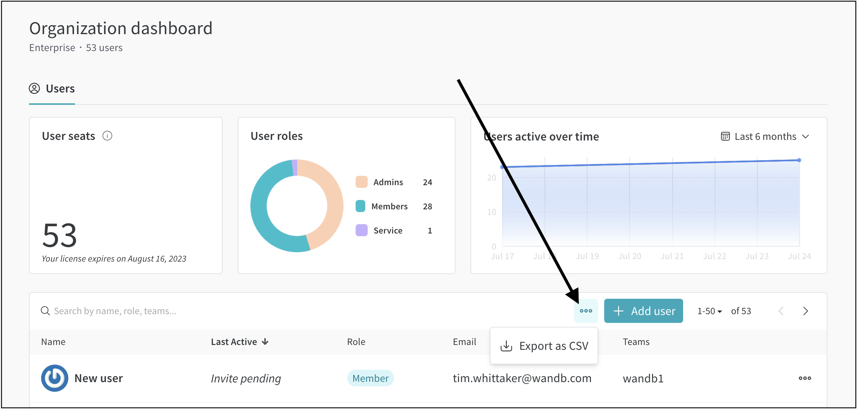 これにより、すべてのユーザーのユーザー名、最後にアクティブだった時刻のタイムスタンプ、役割、メール、所属チーム、およびステータス(アクティブ、保留中、無効)が一覧された CSV ファイルがエクスポートされます。