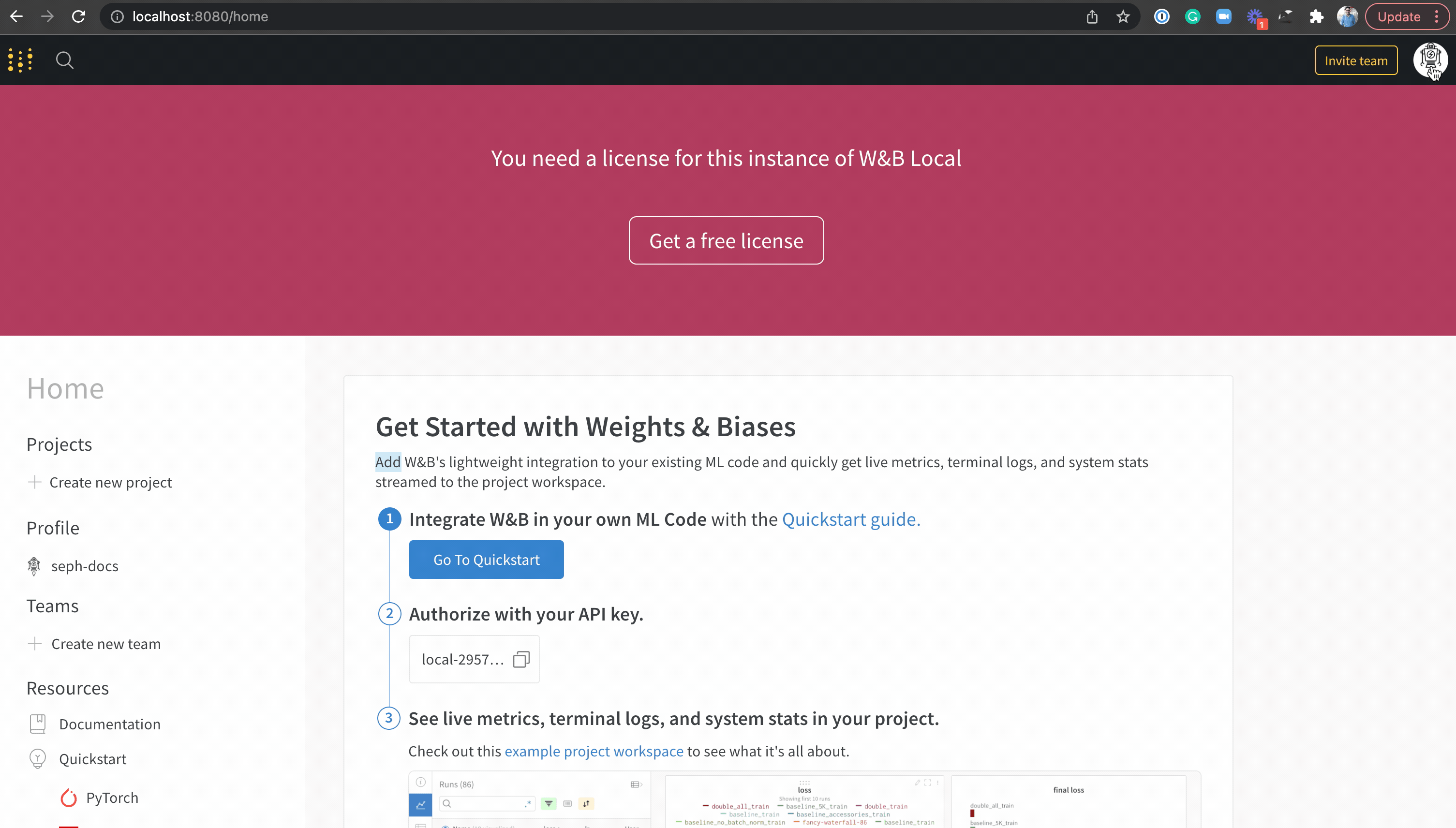 ローカルマシンでW&Bが実行されていることを確認します。http://localhost:8080/home に移動します。ブラウザにW&BアプリUIが表示されるはずです。