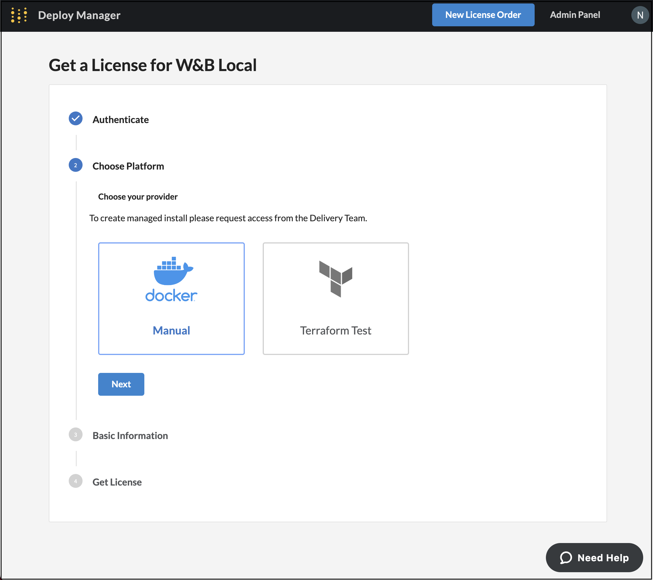 W&B Deploy Managerにアクセスしてhttps://deploy.wandb.ai/deploy でTrial Mode W&Bライセンスを生成します。