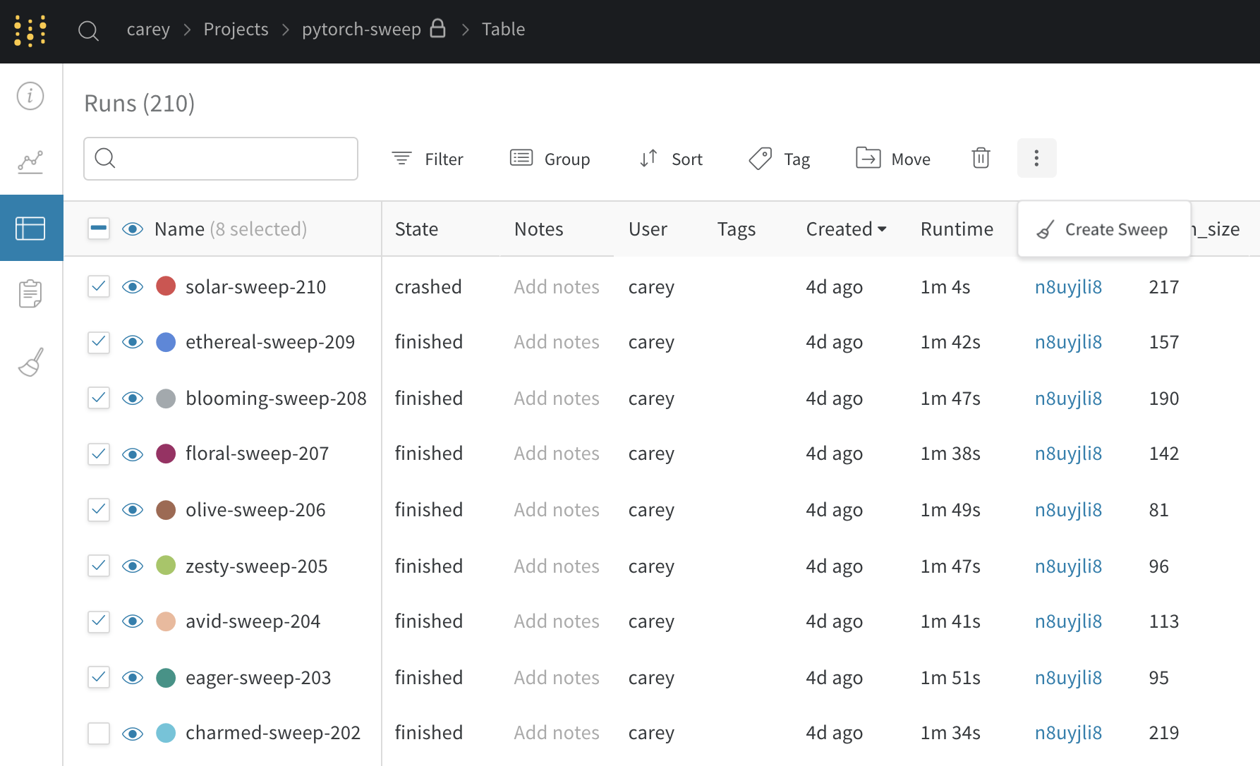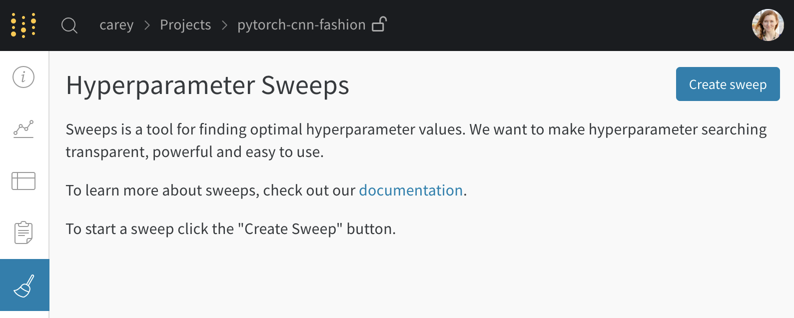プロジェクトページ から、サイドバーの Sweep タブ を開き、Create Sweep を選択します。