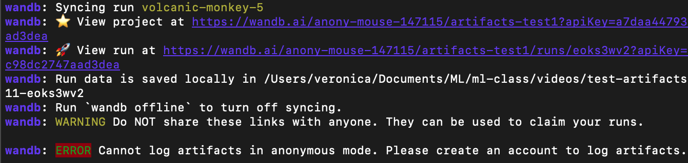 - 아티팩트 로깅 불가: 실행은 커맨드라인에 아티팩트를 익명 실행에 로그할 수 없다는 경고를 출력합니다.