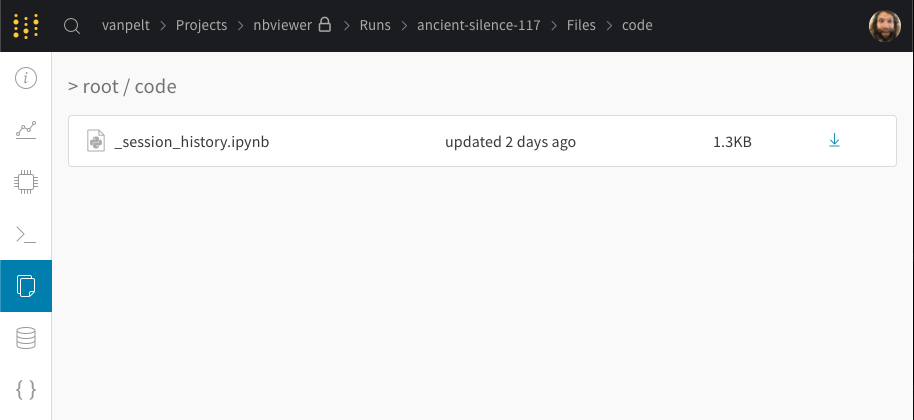 이 파일을 클릭하면 세션에서 실행된 셀과 iPython의 디스플레이 메소드를 호출하여 생성된 출력물이 표시됩니다. 이를 통해 주피터 내에서 특정 run에서 실행된 코드가 정확히 무엇인지 확인할 수 있습니다. 가능한 경우 코드 디렉토리에서 가장 최근 버전의 노트북도 저장합니다.