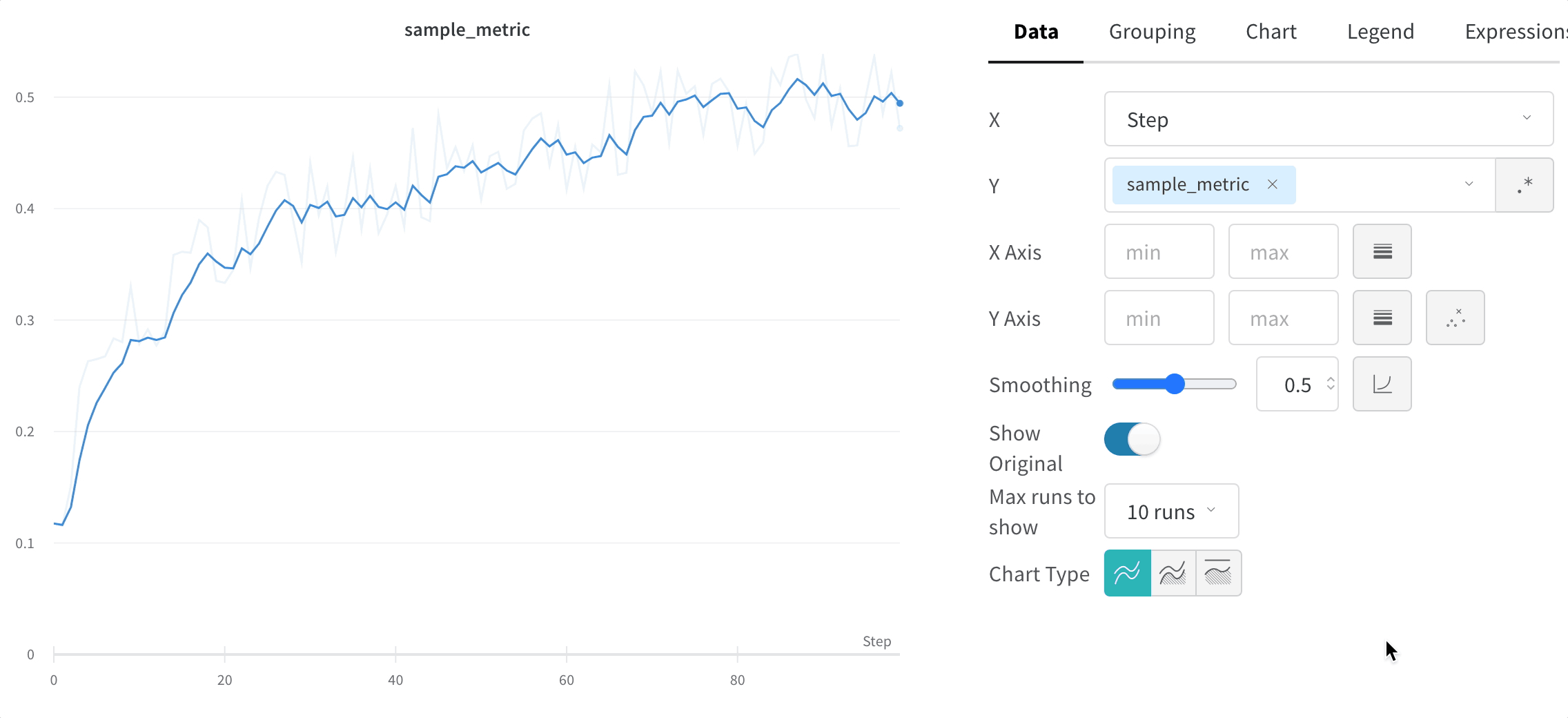 기본적으로 우리는 배경에서 희미한 선으로 원본, 스무딩되지 않은 데이터를 보여줍니다. 이를 끄려면 Show Original 토글을 클릭하세요.