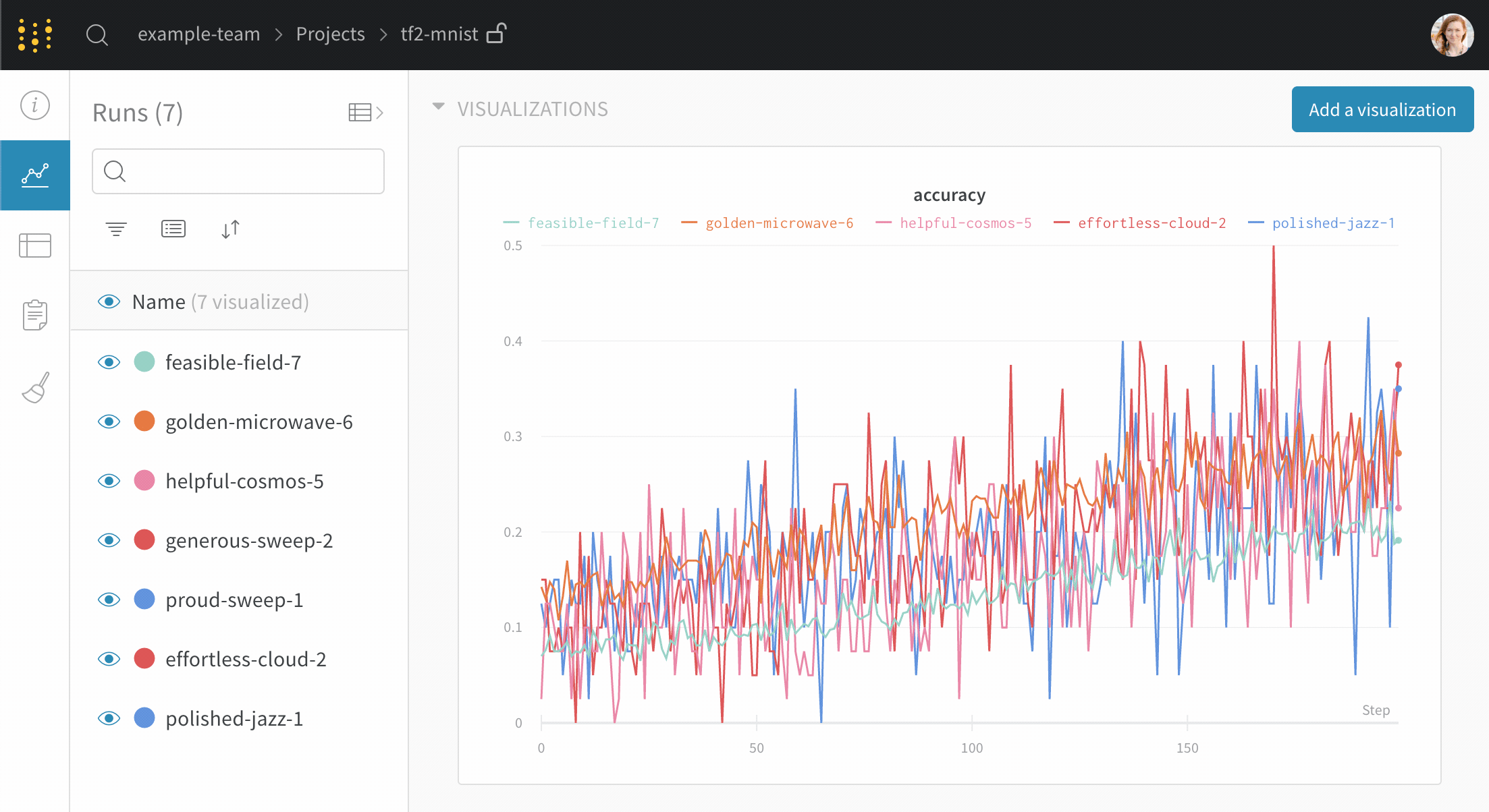 프로젝트 페이지에서 우리는 사이드바에서 run을 보여줍니다. 사이드바를 확장하여 표에서 run들의 하이퍼파라미터와 요약 메트릭을 확인하세요.