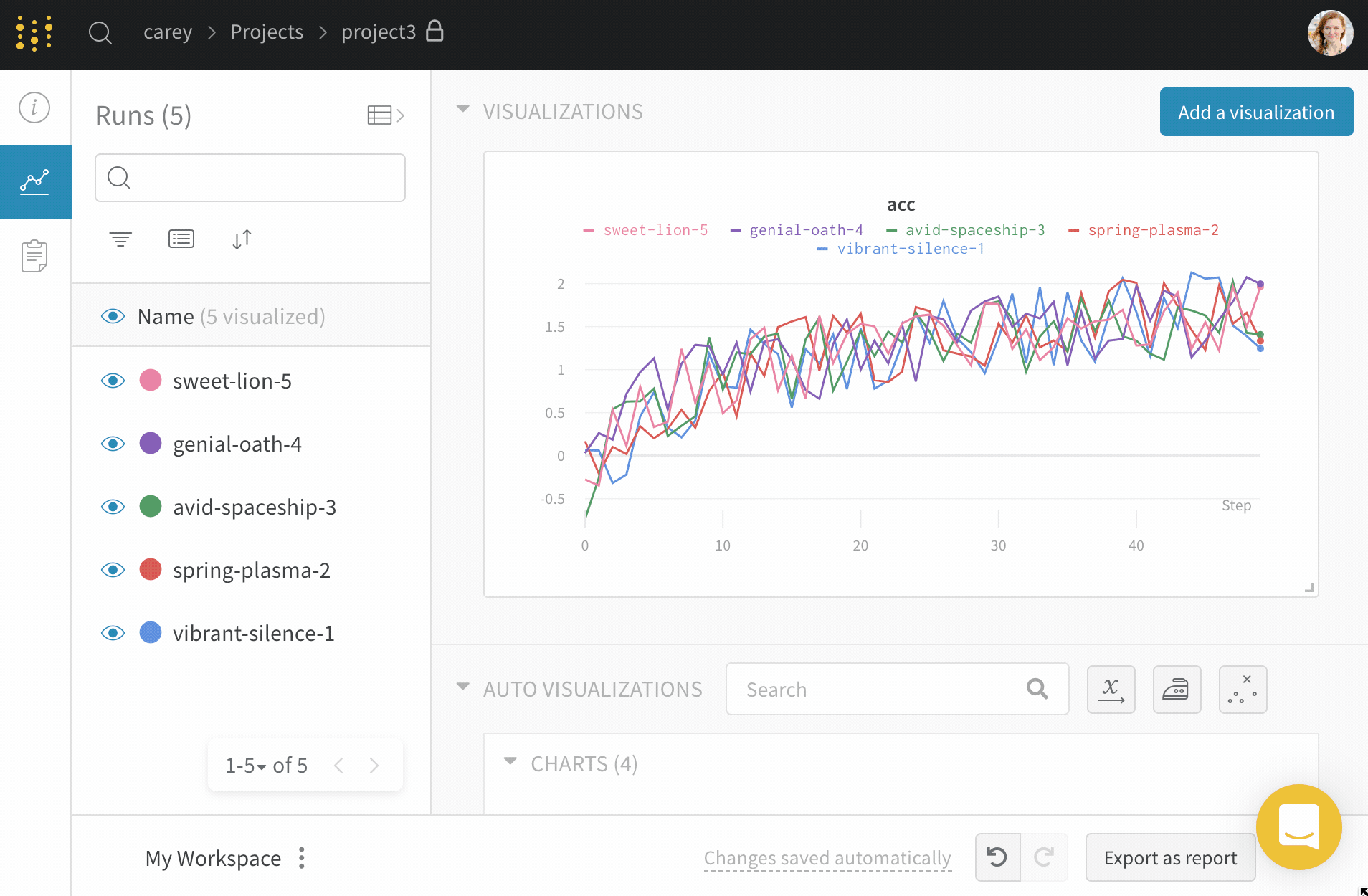 프로젝트 페이지의 그래프를 위한 더 많은 공간을 만들고 싶으신가요? 열 헤더의 가장자리를 클릭하고 드래그하여 사이드바의 크기를 조정하세요. 그래프에서 run을 켜고 끄는 눈 아이콘을 여전히 클릭할 수 있습니다.