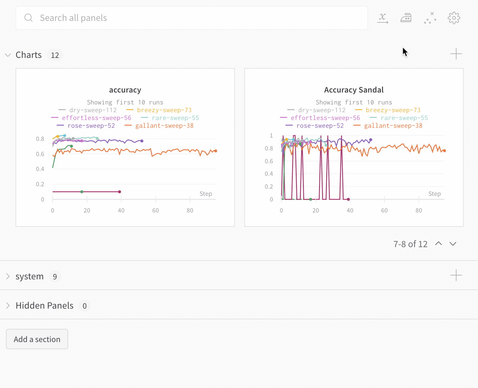 - 검색: 이름으로 run을 검색하세요. 이것은 또한 그래프에서 보이는 run을 필터링합니다.