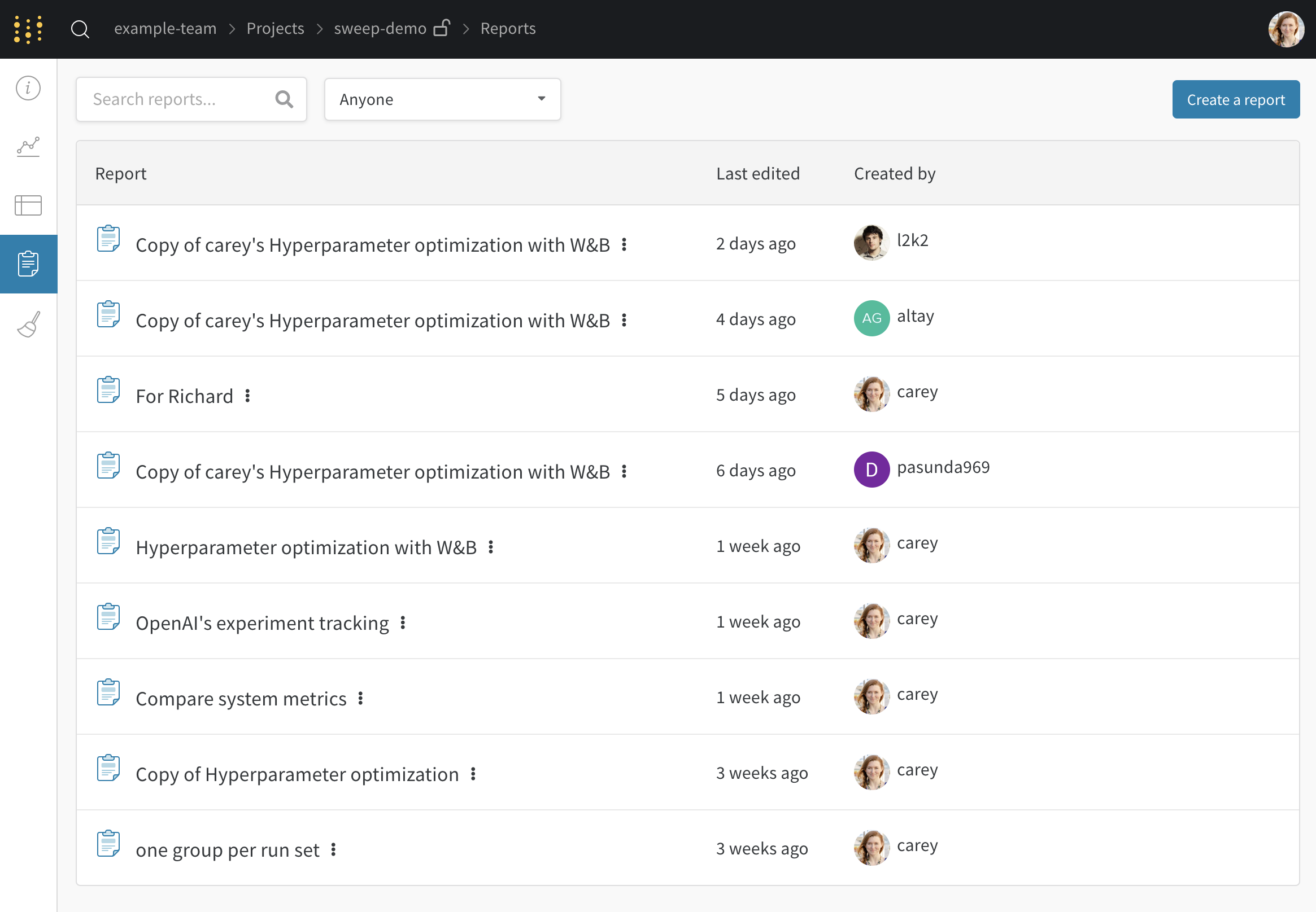 - Reports: 노트, run, 그래프의 저장된 스냅샷