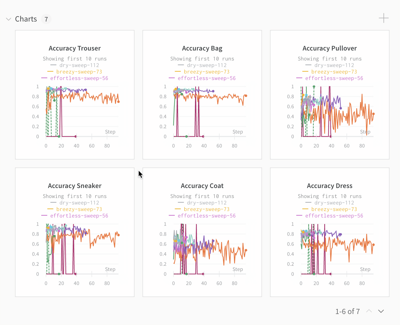 앞의 이미지는 val_loss 열을 기반으로 한 필터를 보여줍니다. 이 필터는 검증 손실이 1 이하인 run을 보여줍니다.