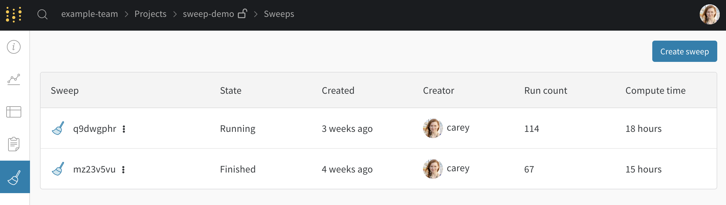 프로젝트에서 새로운 sweep을 시작하세요.