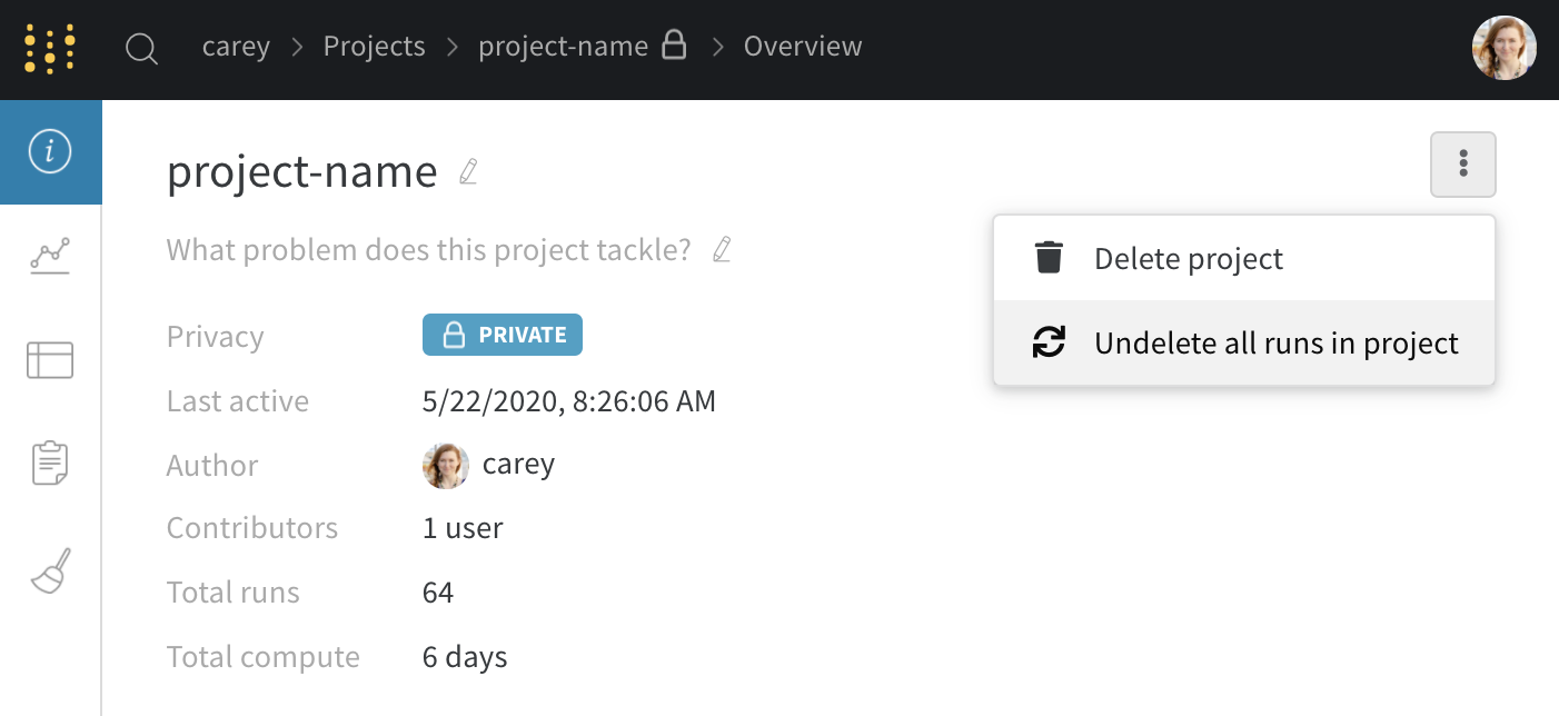 - run 복구: 드롭다운 메뉴를 클릭하고 "모든 run 복구"를 클릭하여 프로젝트에서 삭제된 run을 복구하세요.
