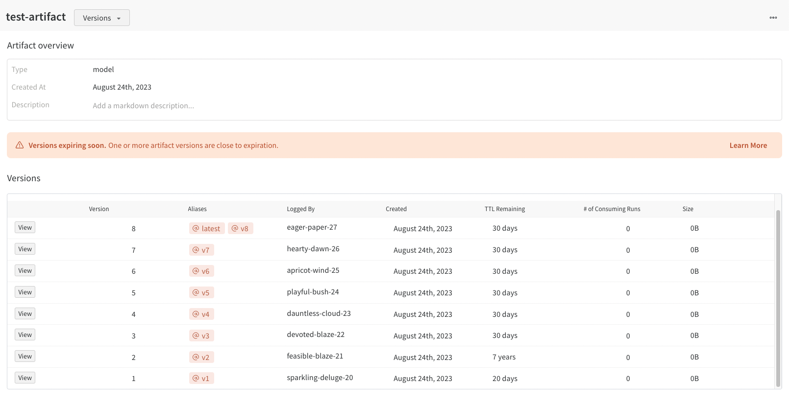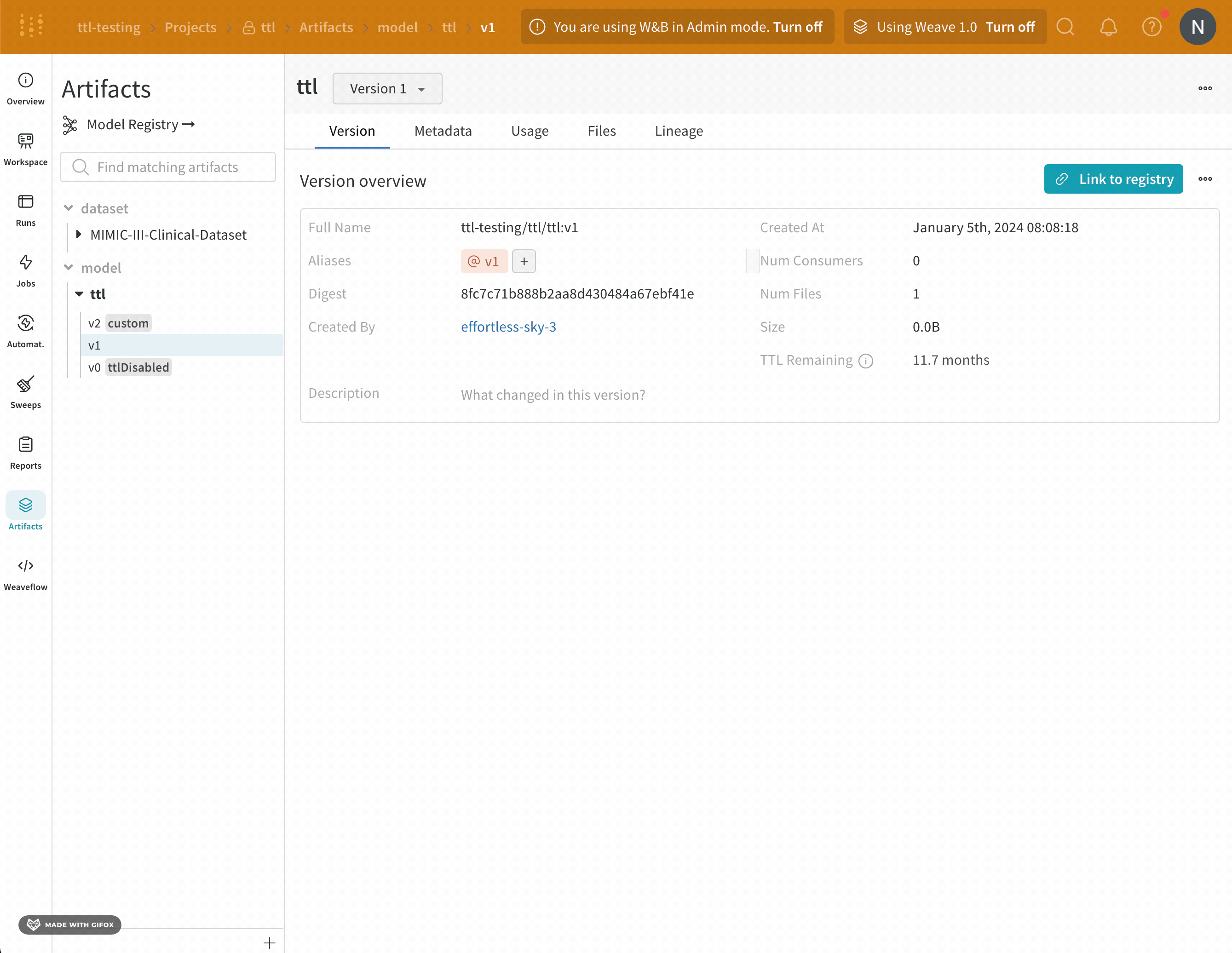 W&B app UI에서 아티팩트의 TTL 정책을 보세요.