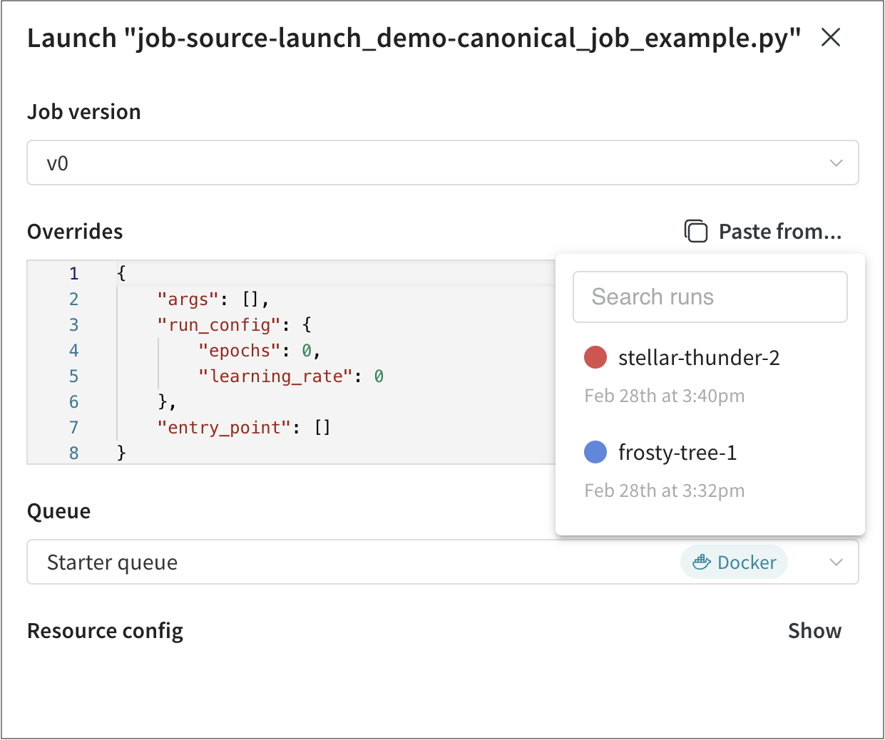Paste from... 버튼을 클릭하여 launch job을 사용한 다른 W&B run에서 값을 복사하여 붙여넣을 수 있습니다.