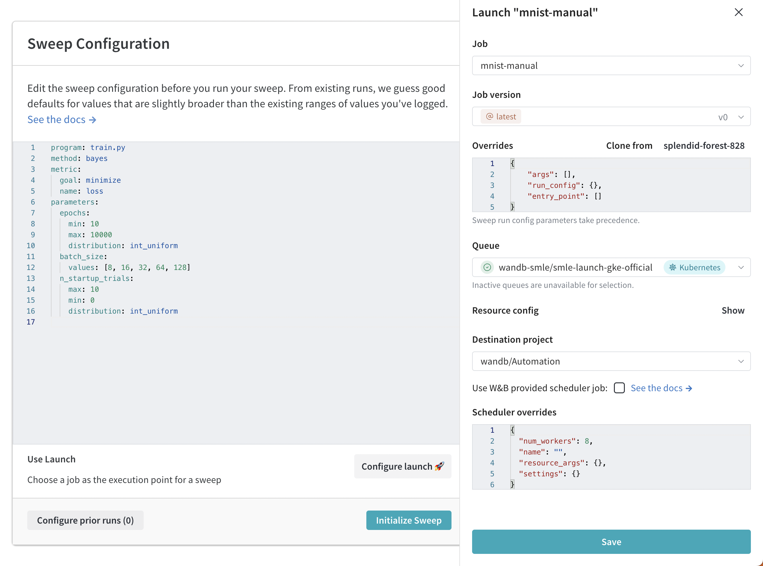 'wandb/sweep-jobs/job-wandb-sweep-scheduler:latest' scheduler블록을 추가하여 이 이름을 가리키는job키가 포함된 구성 yaml을 구성하세요. 아래 예시를 참조하세요.- 새 구성으로