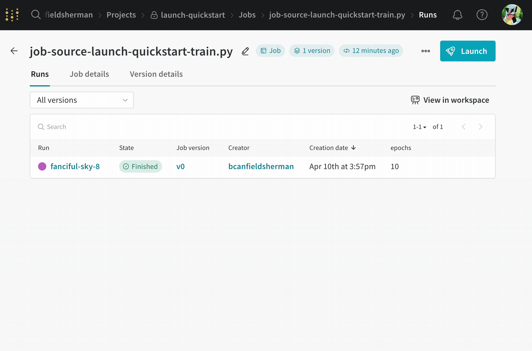 Jobs 페이지에는 이전에 실행된 run으로부터 생성된 W&B Jobs의 목록이 표시됩니다. job-source-launch-quickstart-train.py:v0라는 이름의 작업을 볼 수 있습니다. 런치 작업을 클릭하여 소스 코드 의존성과 런치 작업에 의해 생성된 run 목록을 확인하세요.